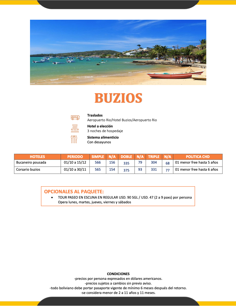 | Corsario buzios | 01/10 a 30/11 | 565 | 154 | 375 | 93 | 331 | 77 | 01 menor free hasta 6 años |