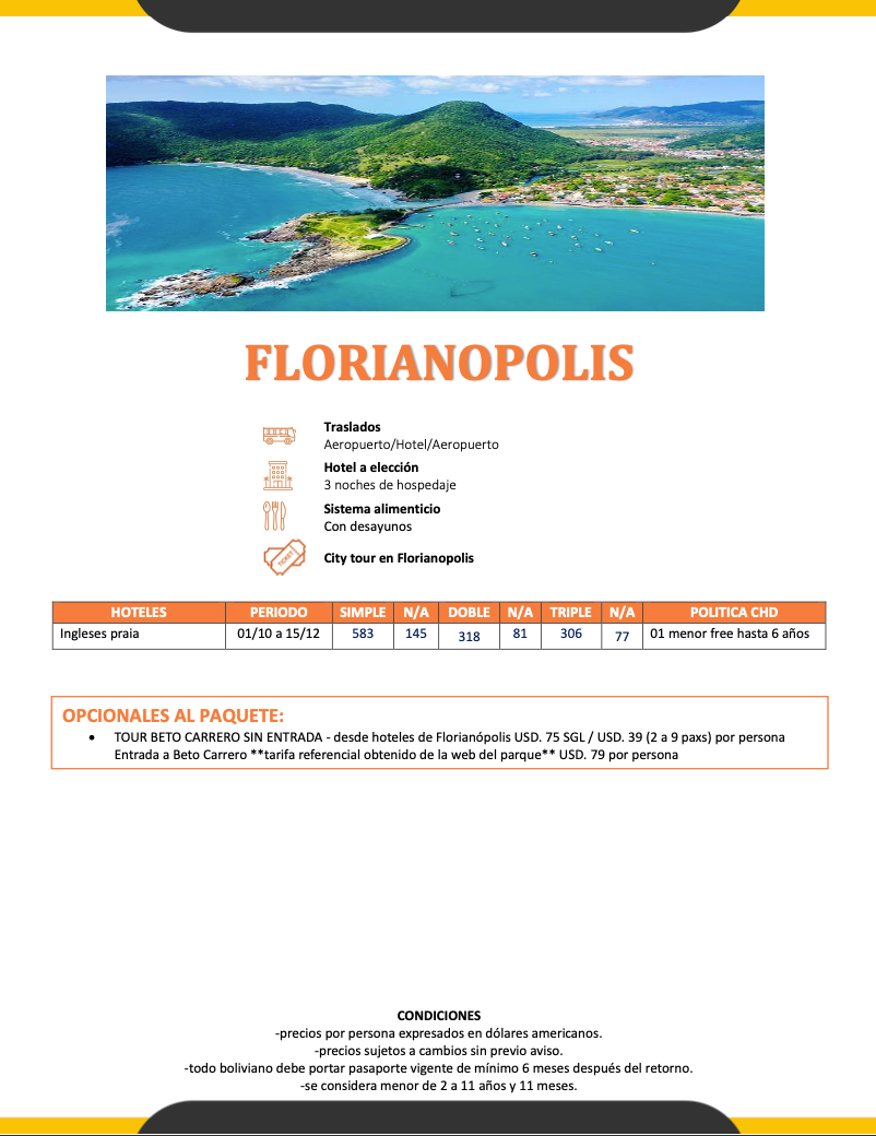 TOUR BETO CARRERO SIN ENTRADA - desde hoteles de Florianópolis USD. 75 SGL / USD. 39 (2 a 9 paxs) por persona Entrada a Beto Carrero **tarifa referencial obtenido de la web del parque** USD. 79 por persona
